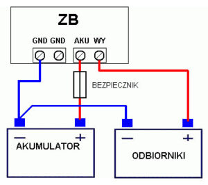 Zabezpieczenie akumulatora przed głębokim rozładowaniem z serii ZB rozłącza zasilanie odbiorniku po rozładowaniu akumulatora.